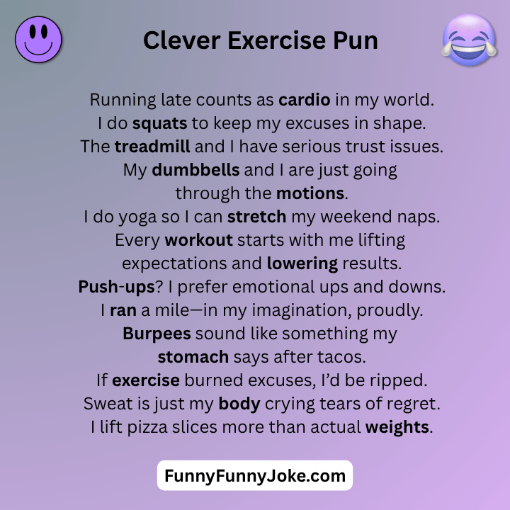 Looking to flex your funny bone? You’ve come to the right gym! Exercise puns are the perfect way to lift your spirits without breaking a sweat. Whether you’re a fitness fanatic or someone who only runs late, these witty wordplays will have you doing mental push-ups from laughter. From clever gym jokes that “work out” perfectly to treadmill puns that keep you running with humor, this collection proves that comedy can be the best kind of cardio. After all, laughter burns calories too—right? So grab your water bottle, stretch your smile muscles, and get ready to squat, sprint, and sweat through a workout of pure wit. These exercise puns will keep your energy up, your mood light, and your sense of humor in top shape. Remember, the only thing you should lose today is your seriousness!